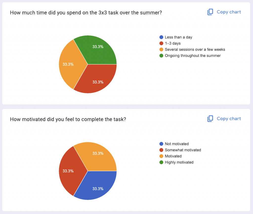 Some students engaged ongoingly across the summer, while others treated it as a short, discrete task (1–3 days). Lower motivation often stemmed from uncertainty about what the task was “for”: Students who didn’t see how the 3×3 would connect to Year 2 felt less compelled to invest.