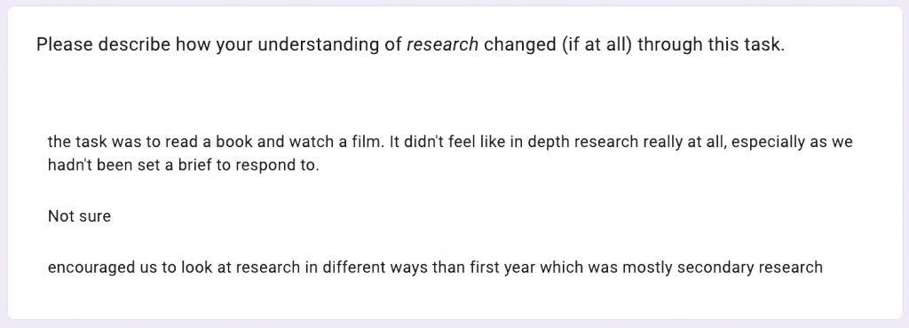 For a portion of students, the project shifted research from something instrumental to something exploratory, but this shift was not universal. Some students still interpreted the task very literally: “The task was to read a book and watch a film” while Others articulated a broader change, seeing research as non-linear and Understanding references as something to return to, not just extract from. Some students recognised that research was a way of building a personal perspective, not just visual content